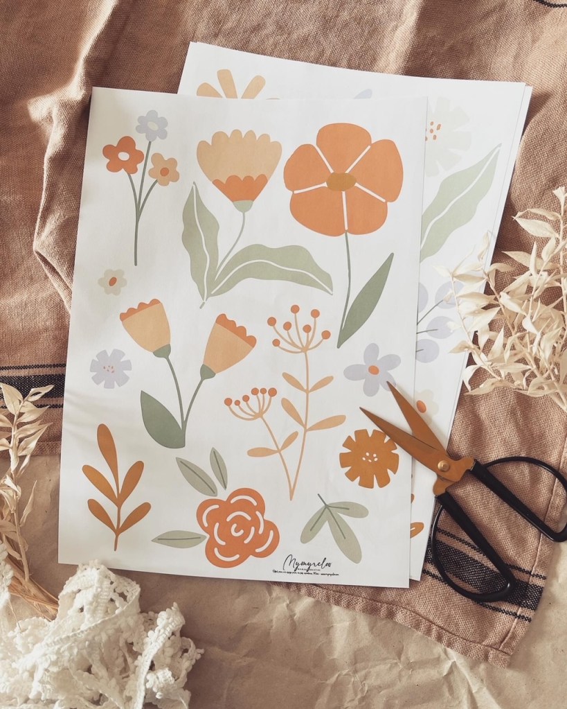 Puis, découpez les fleurs en laissant un petit bord blanc (environ 0,5cm) pour plus de simplicité. Composez votre bouquet idéal et scotchez les tiges au dos du vase. Puis recouvrez le scotch avec le 2eme vase en papier pour que la carte soit bien propre.