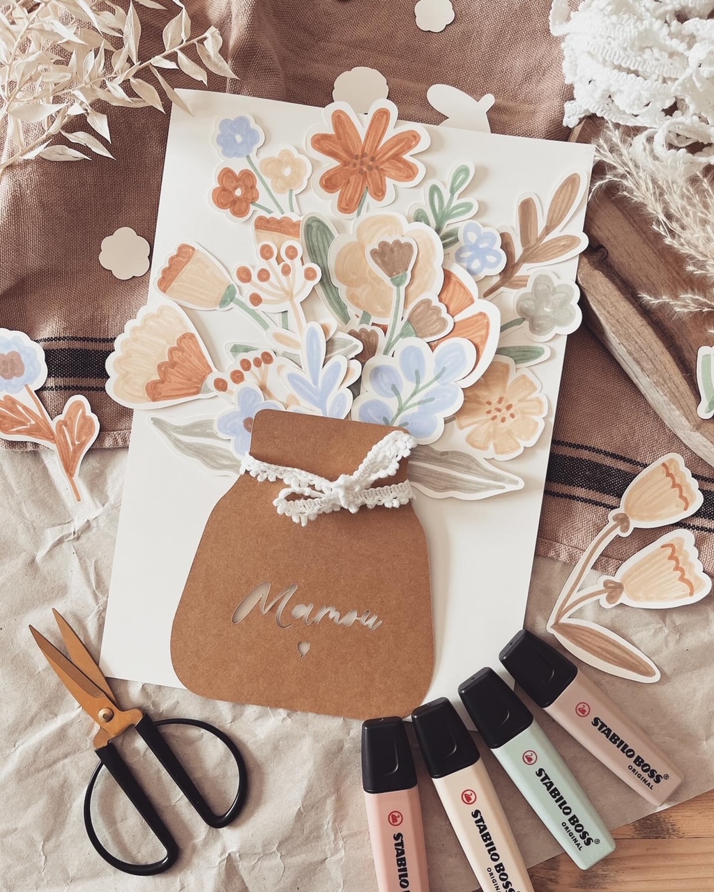 Découpez d’abord le vase en 2 exemplaires, qui sera votre « carte », vos kids peuvent bien sûr la customiser comme ils le souhaitent avec un message, des dessins, etc… Le second vase peut juste être reporté sur une feuille blanche, pas besoin d’imprimer cet exemplaire.