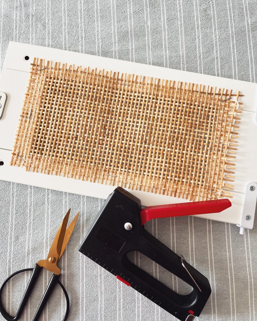 Pour le cannage, je l’ai trouvé chez Cultura. Il faut le faire tremper dans de l’eau tiède pendant 15min, puis l’aplatir autant de temps. Ensuite, il faut le travailler encore mouillé, je l’ai donc agrafé avec mon agrafeuse à tapissier, avec des petites agrafes.