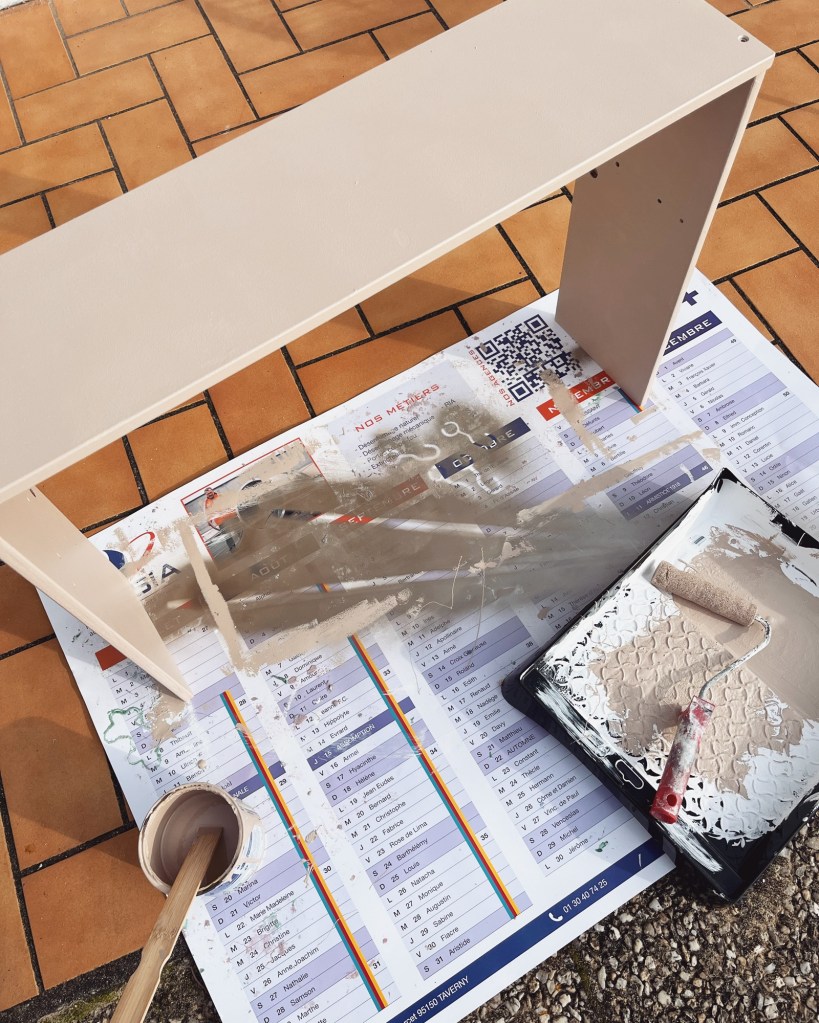 J’ai repeint toutes les parties roses en crème de café (un reste de peinture murale de la chambre de Malo !). Pour ça, je n’ai pas tout démonté et ça a très bien suffit avec un peu de scotch de masquage.