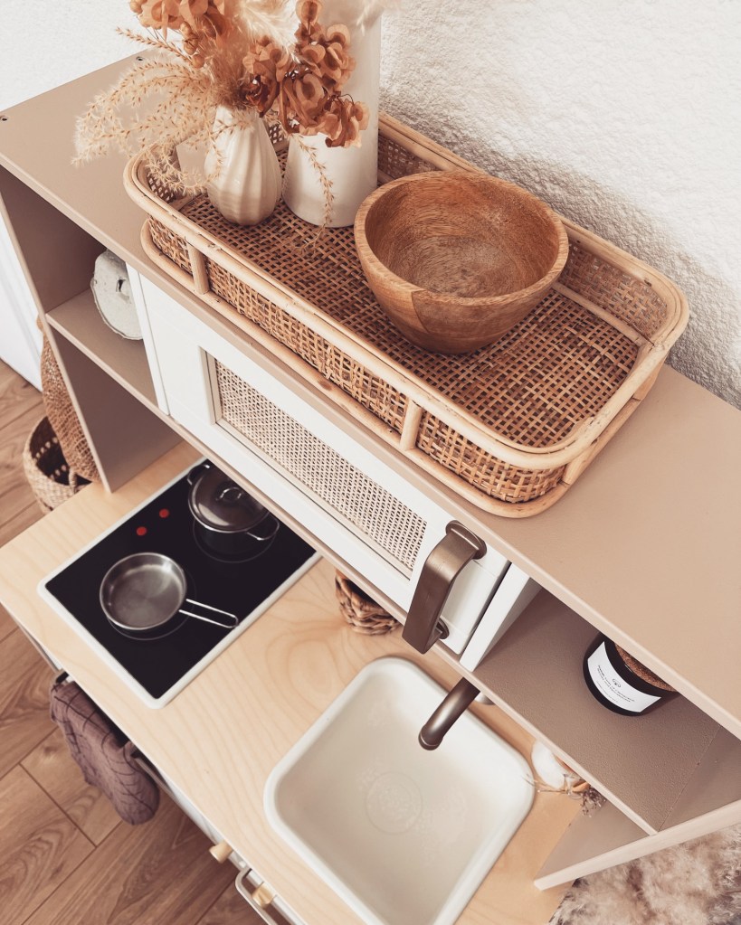 Et j’ai accessoirisé ! Quelques pots et paniers en jacinthe et bois, un torchon en gaze de coton, des petits accessoires naturels et voilà !
