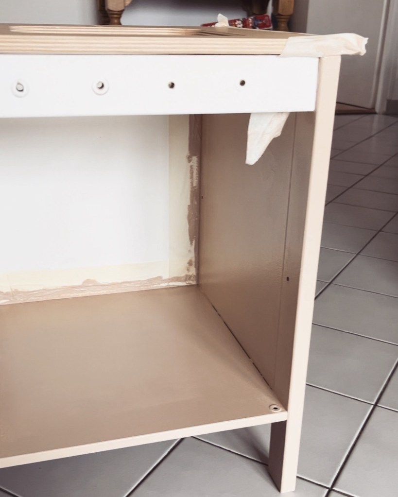 J’ai retiré le sticker « effet marbre » qui a permis de garder le plan de travail nikel, donc ça c’était la bonne nouvelle, le plan est comme neuf, parfait pour cette 2eme vie ! Et je le laisse en bois cette fois.