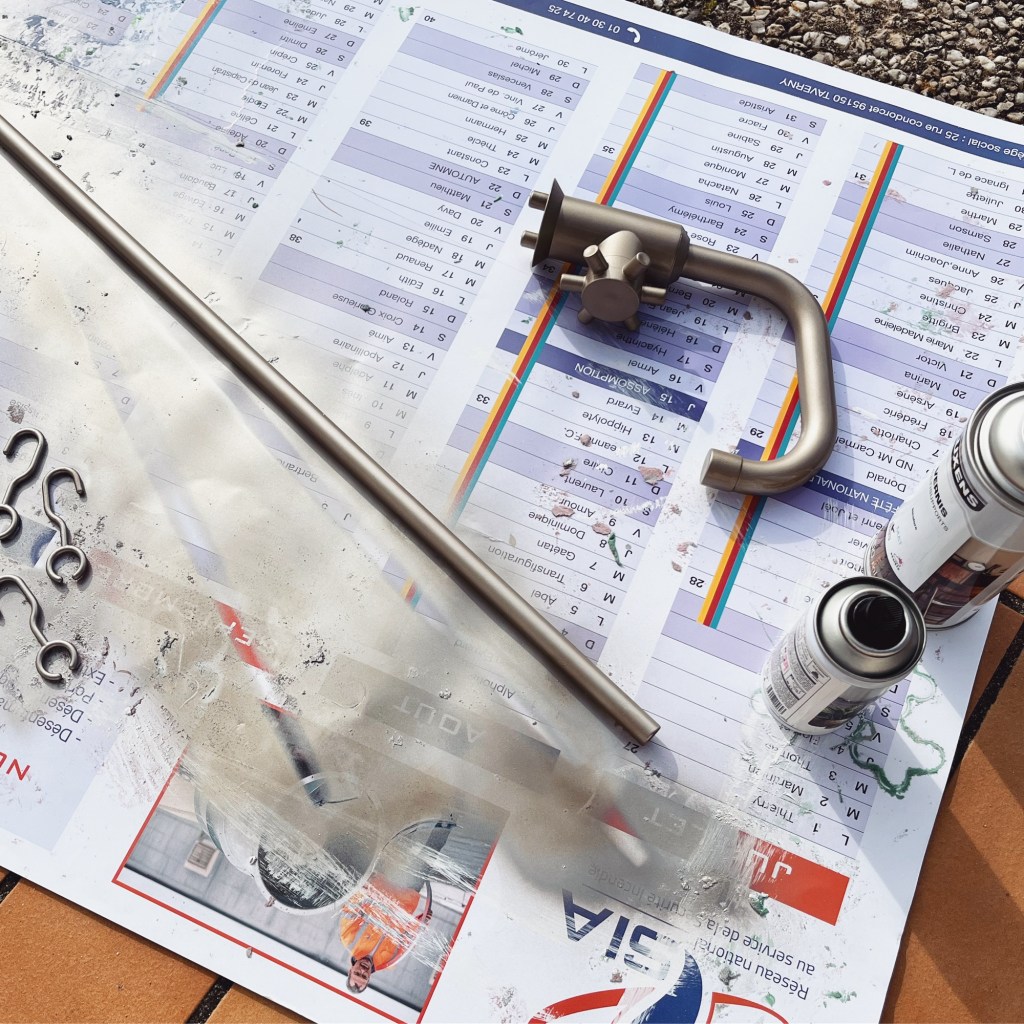 J’ai tout lavé et gratté. Puis, j’ai bombé en cuivre clair et écru mat les access et revernis toussa. J’ai utilisé des bombes, c’est plus simple. Pourtant, je pense que cela ne tiendra pas dans le temps ! Le plastique de base est très lisse et suite au 1er hack, j’ai vu que cela ne tenais pas dans le temps (surtout le fond de l’évier qui est soumis à rude épreuve !) et malgré une vendeuse qui m’a assuré que cela tiendrai, je reste sceptique.
